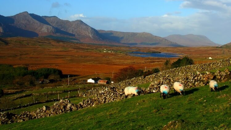 Rising on the opposite side are the Maamturk Mountains, some of the wildest and most challenging mountains in County Galway for hikers. Another familiar sight in the Inagh Valley is the ubiquitous Connemara sheep. Characteristics of the Connemara sheep are: black legs, a black head and great stress resistance when it comes to avoiding car drivers along the local roads.